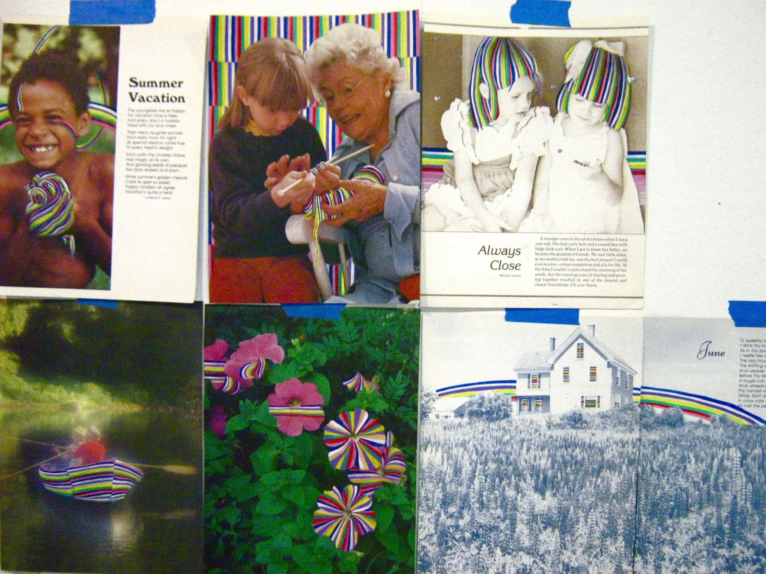 During Hur’s residency at Ox-Bow, the artist found a collection of Friendship Magazines from the 1970s at a thrift store in Saugatuck, Michigan. Upon these idealistic images of Americana, the artist paints the colorful stripes from her floor installations to imagine an alternate landscape.